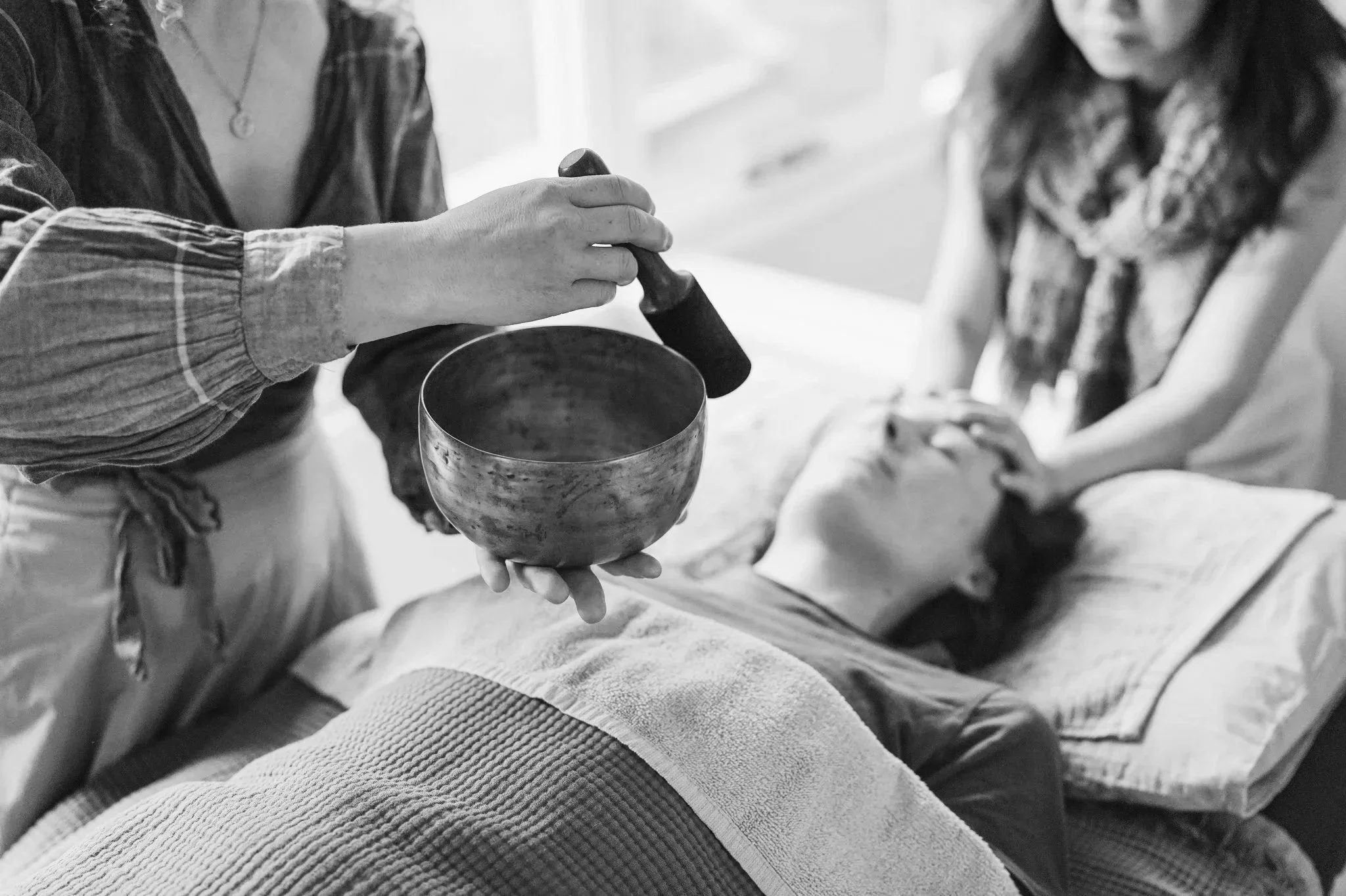 This is not a performance, but a carefully held therapeutic environment. One practitioner supports the body through gentle, attentive touch, while the other offers live sound to guide and nourish the system through vibration and tone.